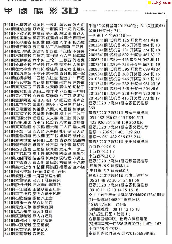 杀手+鑫马快报+字迷汇总25年341期3d图谜-千禧3d试机号金码关注码杀码_今天3d试机号金码查询_排列三试机号金码
