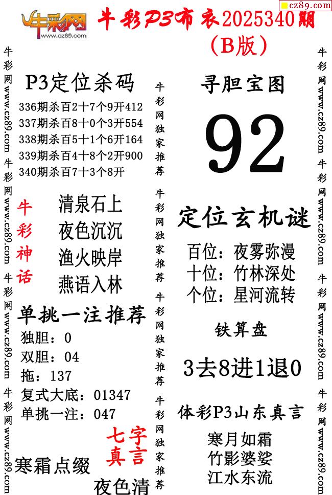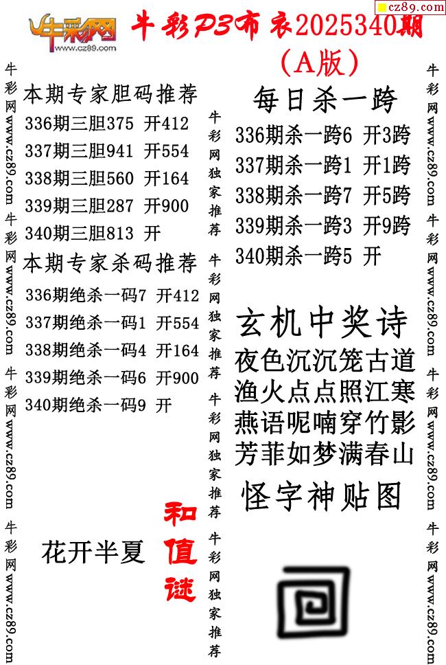 牛彩P3布衣25年340期AB版图谜(精华版)-千禧3d试机号金码关注码杀码_今天3d试机号金码查询_排列三试机号金码